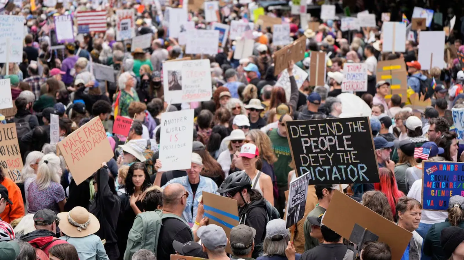 شهدت مختلف الولايات الأمريكية اليوم السبت، مظاهرات حاشدة ضد الرئيس الأمريكي السابق دونالد ترامب، شاركت فيها عشرات المنظمات المدنية والحقوقية، تحت شعار “لا ملوك، لا قوات، ولا مليارديرات في مدننا” (No kings, no troops and no billionaires in our cities).